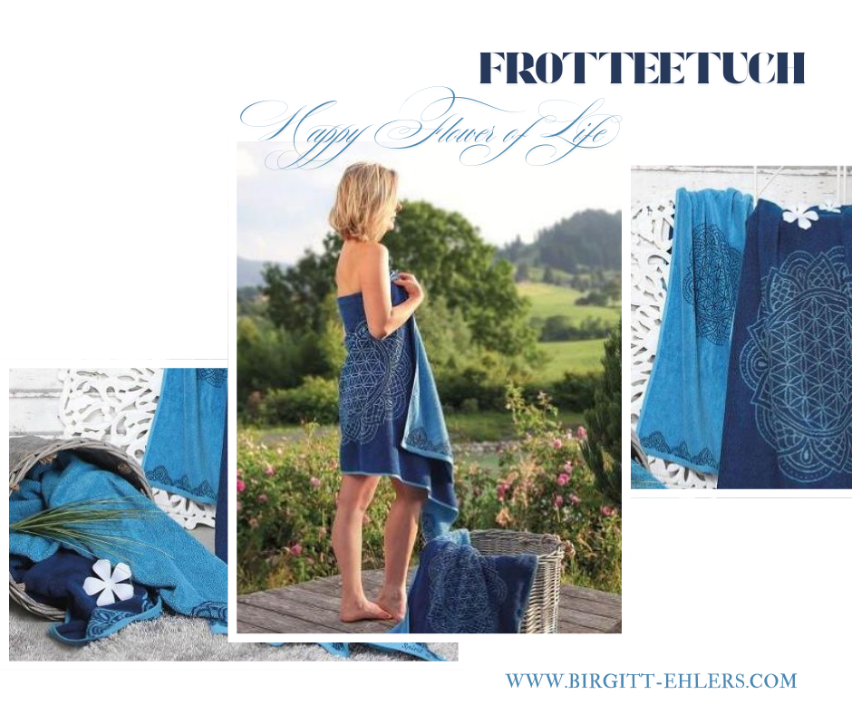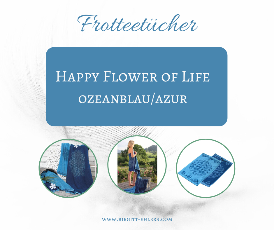 Genieße das außergewöhnlich angenehme Gefühl, dich mit den einzigartigen Feng-Shui-Frotteetüchern Happy Flower of Life in Ozeanblau/Azur abzutrocknen (positive Feng Shui Maße).