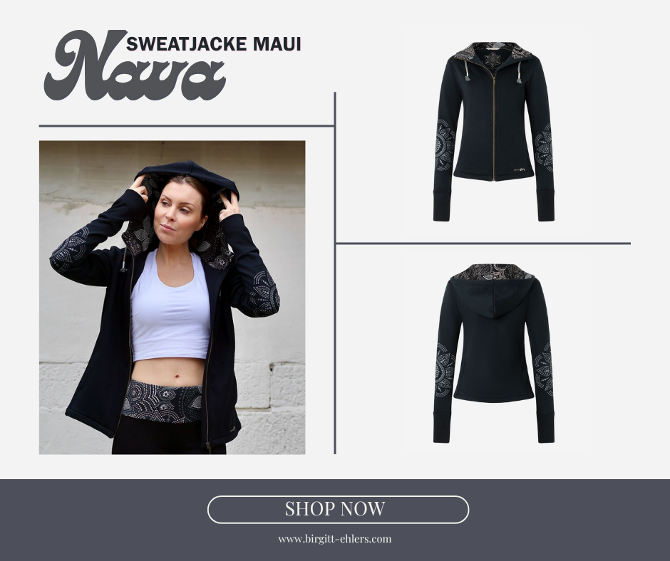 Mit ihrer anliegenden Passform und eleganten Details in Schwarz ist die Sweatjacke Maui Nava ein echter Hingucker und die ideale Begleitung für Yoga, Freizeit oder einfach als gemütliches Lieblingsstück für den Alltag.