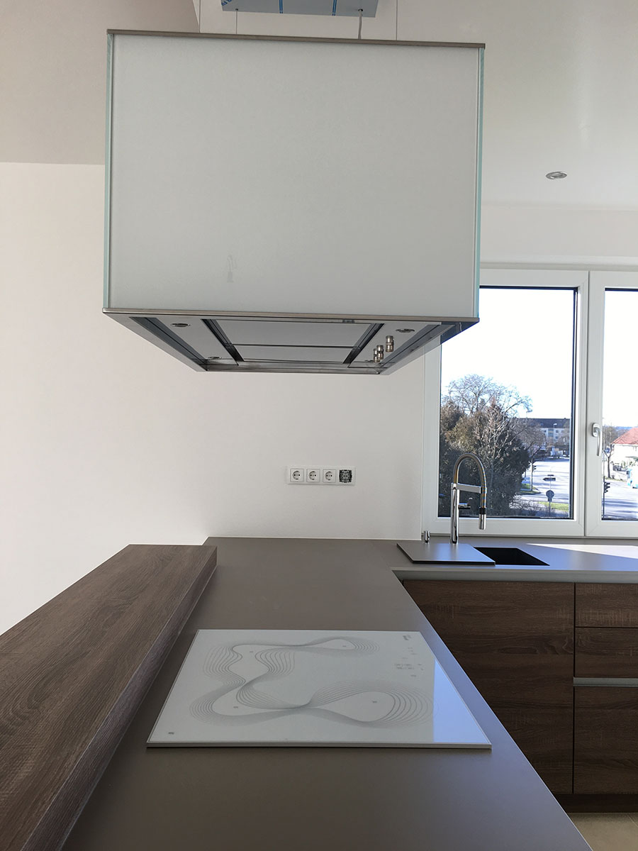 Das Penthouse ist fertiggestellt und teilmöbiliert. Die Wohnräume über den Dächern Landshuts bestechen durch ihre klare Architektursprache.