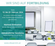 Damit wir für unsere Patienten immer auf den neuesten Stand der Technik sind, ist von Montag, den 12. Februar bis Donnerstag, den 22. Februar 2024 unsere Ordination wegen einer Fortbildungsveranstaltung geschlossen.
