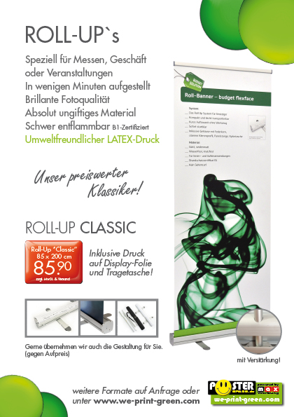 Classic Roll-Up mit Folie, hochwertiger, weißer PET-Roll-Up Film, matte Oberfläche mit silbergrauer Rückseite, hervorragende Planlage für das professionelle Roll-Up Display, inkl. hochwertiger Tragetasche
